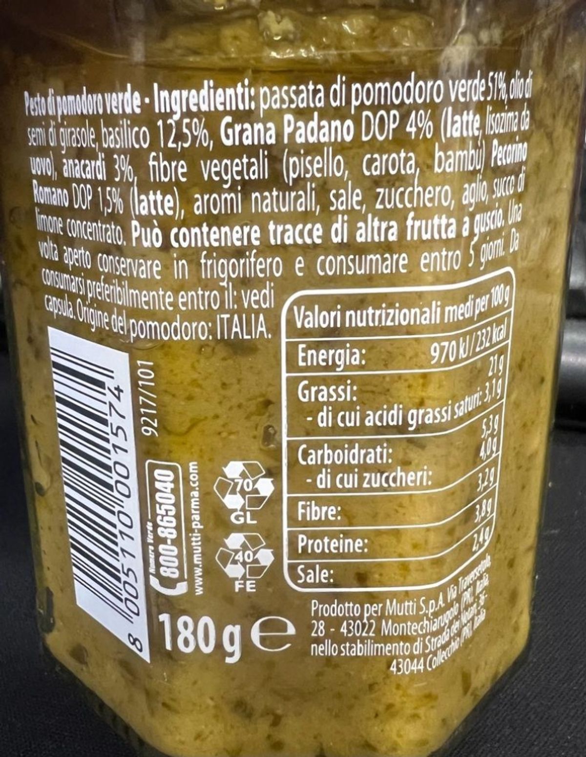 Muttis 180 Gramm grünes Tomatenpesto ist eine köstliche und innovative Neuheit in der Welt der Pestos. Dieses Pesto besteht zu 51 % aus grünen Tomaten und bietet den intensiven Geschmack traditioneller Pestos, jedoch mit 45 % weniger Fett als das durchschnittliche, meistverkaufte Pesto. Das Rezept, das den Einsatz von Öl einschränkt, kombiniert grüne Tomaten mit frischem Basilikum, Cashewnüssen, Grana Padano DOP und Pecorino Romano DOP und ergibt so eine ausgewogene und schmackhafte Mischung. Ideal zum Würzen von Nudeln, Salaten und anderen Rezepten. Muttis grünes Tomatenpesto vereint Geschmack und Leichtigkeit und bietet eine gesunde und schmackhafte Wahl für jeden Anlass.