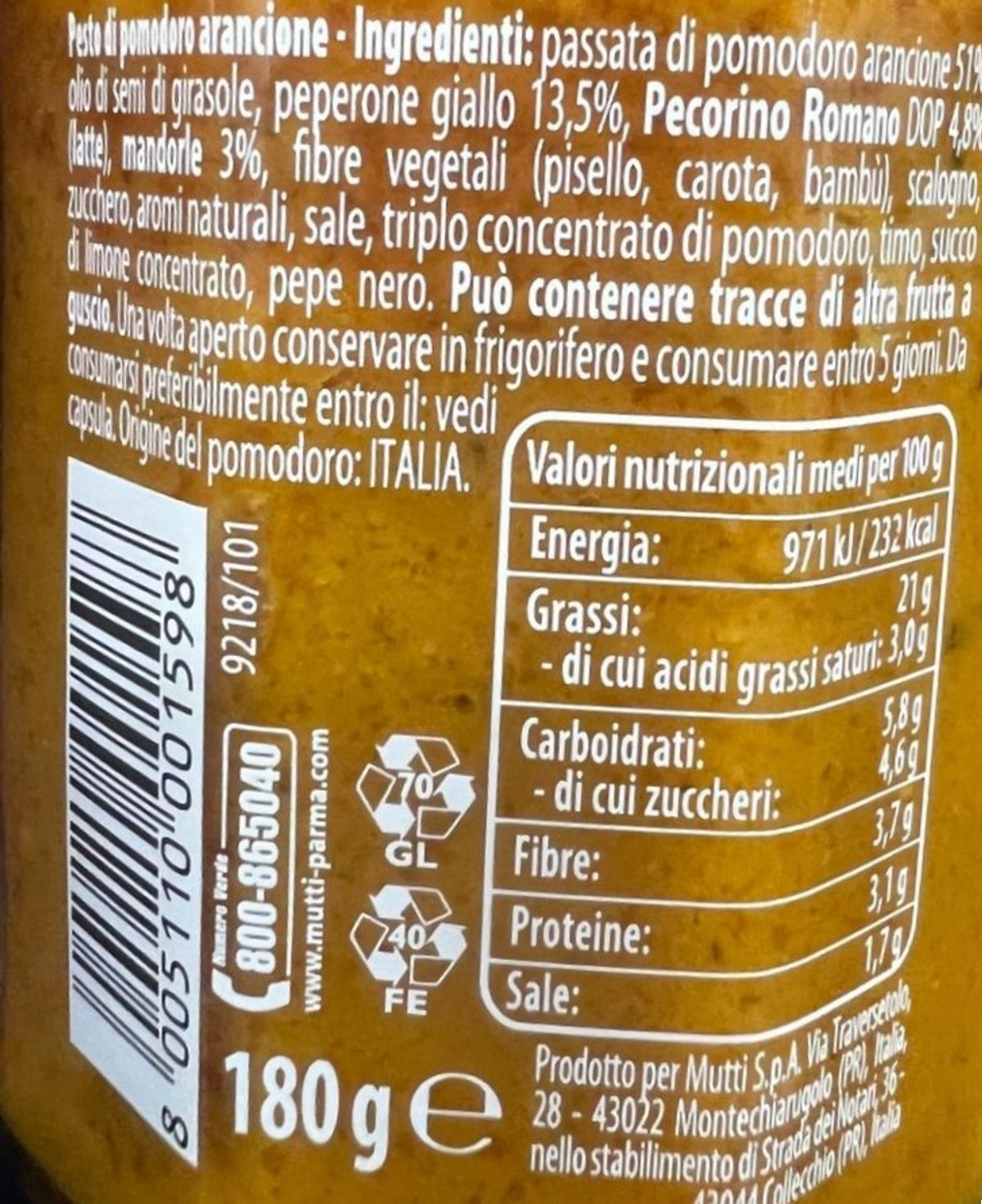 El pesto de tomate y naranja de 180 g de Mutti es una alternativa sabrosa e innovadora al pesto tradicional. Este pesto destaca por el uso de tomate naranja, que representa el 51% de la receta, dando un sabor único y permitiendo reducir el contenido de grasa y sal en un 45% respecto a los pestos más vendidos del mercado. Enriquecido con pimientos amarillos, almendras y Pecorino Romano DOP, el Pesto de Tomate y Naranja ofrece un sabor intenso y auténtico, manteniendo una ligereza que lo hace perfecto para una dieta equilibrada. Ideal para condimentar pastas, bruschetta y otras recetas, este pesto combina tradición e innovación en una mezcla irresistible.